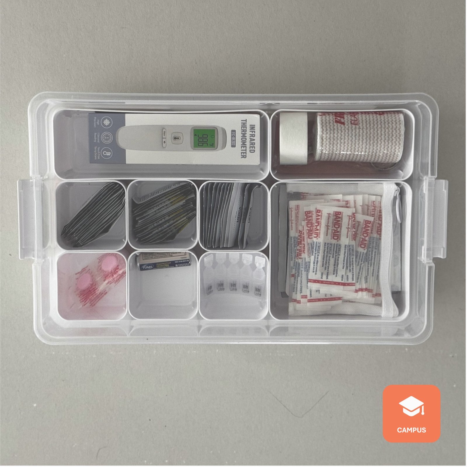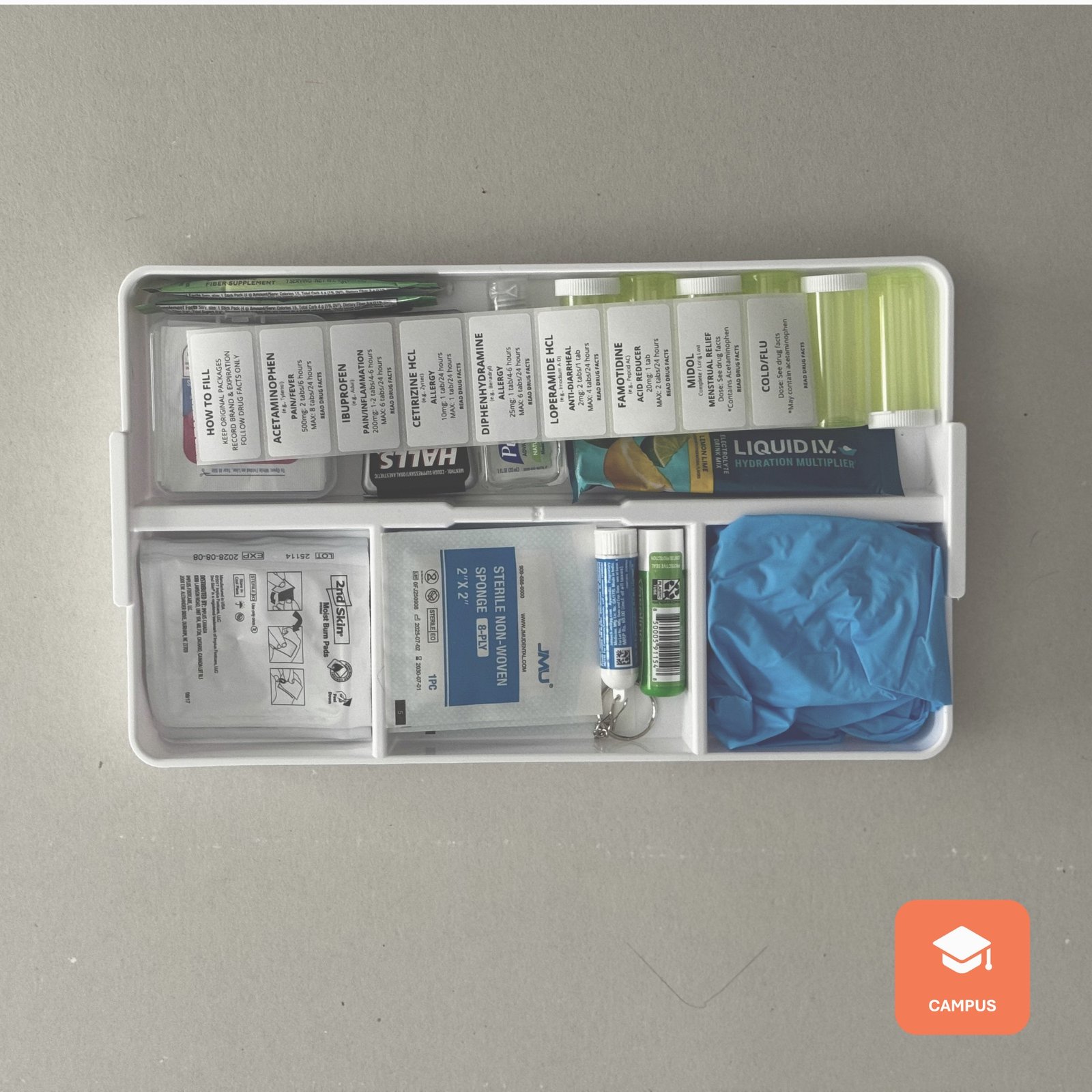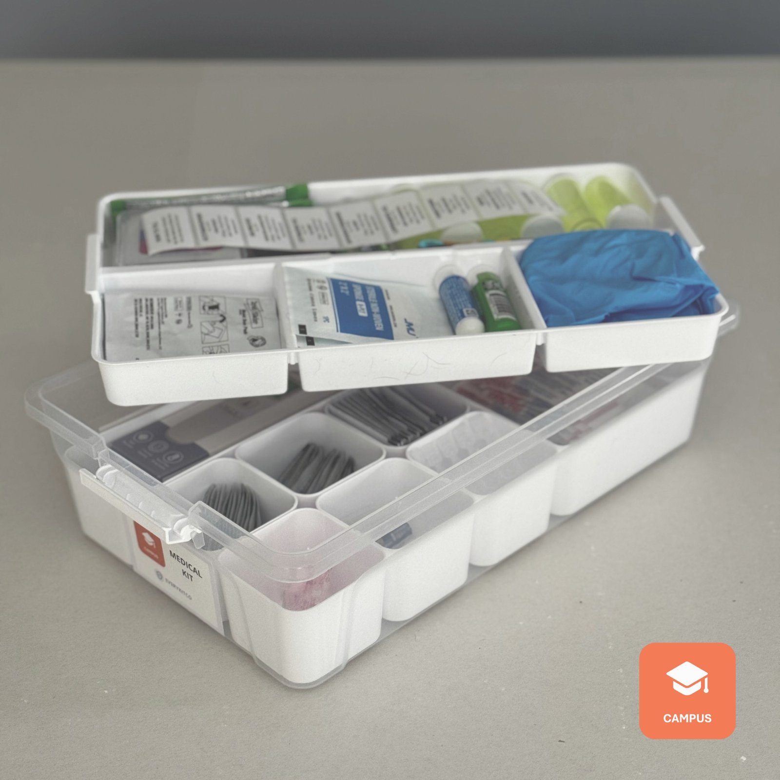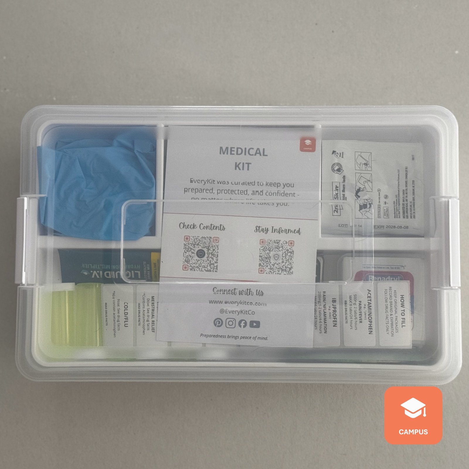 The EveryKitCo Campus Medical Kit is a comprehensive, dorm-ready health and first aid solution designed to support everyday illnesses, minor injuries, and unexpected health needs while away at school. Thoughtfully curated for college life, the kit includes unit-dose medications for pain, allergies, stomach issues, and hydration, along with high-quality first aid supplies for cuts, burns, blisters, and minor injuries—plus essential tools like a thermometer, gloves, and medical scissors. Organized in a durable bin with clear labeling and easy-to-use resources, this kit helps students respond quickly and confidently, while giving parents peace of mind that the essentials are already on hand when they’re needed most.